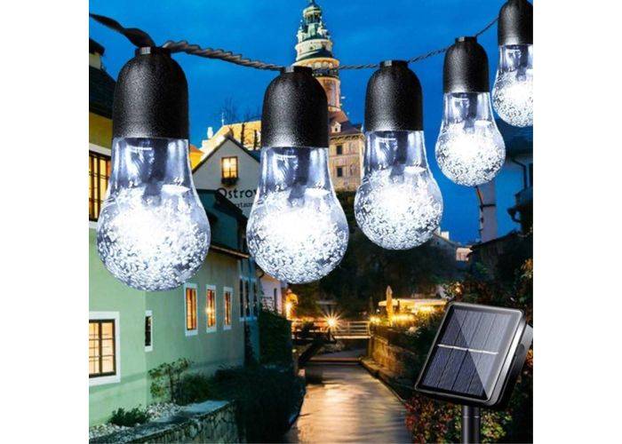 Rigtig flot LED udendørs lyskæde med solceller indbygget. Disse lamper er perfekte til haven og terrassen og ser både godt ud og tjener et godt formål med lys når mørket sænker sig og det er smart at når der er fuld solskin så oplades batteriet automatisk og på en fuld opladning kan du få op til 8 timers lys. En fuld opladning via sollys tager 6 timer. solcellerne oplades også i almindeligt dagslys, men så vil det atge længere tid at oplade. Du kan tænde og slukke for lmapen via power knappen.