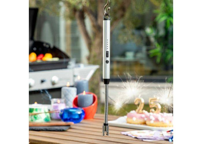 En multifunktionel elektrisk lighter, der tænder stearinlys, grill, gaskomfur, papir, cigaretter, tyndt træ osv. Den har sikkerhedslås og LED-indikatorer, der viser opladningsniveauet.