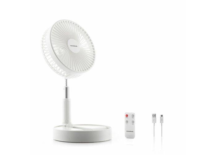 En sammenklappelig, genopladelig ventilator, der er ideel til at nyde en behagelig portion frisk luft overalt. Ekstremt let, multifunktionel, lydløs, 4 hastigheder, timer, justerbar hældning og højde, fjernbetjening og USB-C-kabel.
