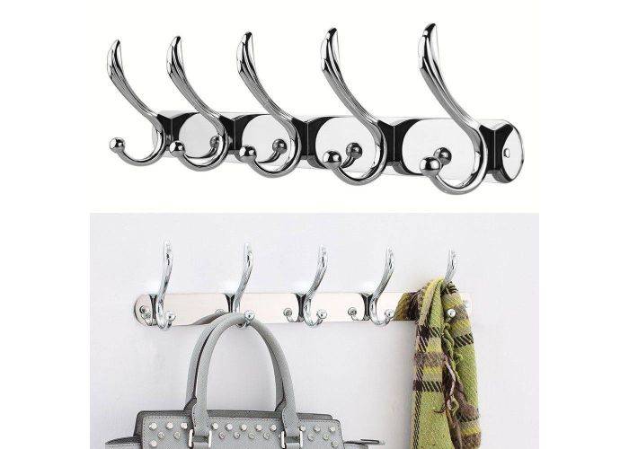 Rigtig flot og elegant knagerække med 5 dobbeltkroge, fremstillet i kvalitets rustfrit stål og forkromet med en skøn finish. Monteres på væg eller dør via de medfølgende skruer og kan monteres alle steder du nu måtte have behov for opbevaring af jakker, tøj mm.