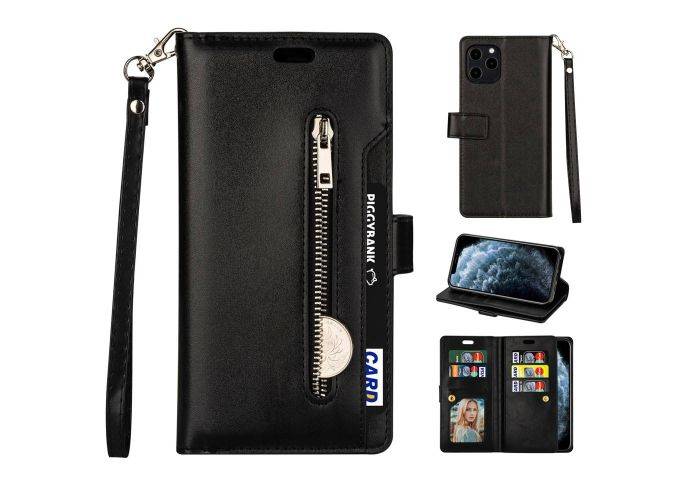 iPhone 12 / 12 Pro - Læder cover / pung - med udvendig lomme med lynlås - Sort