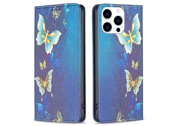 iPhone 14 Pro - Læder cover / pung - Printet design - Gyldne sommerfugle