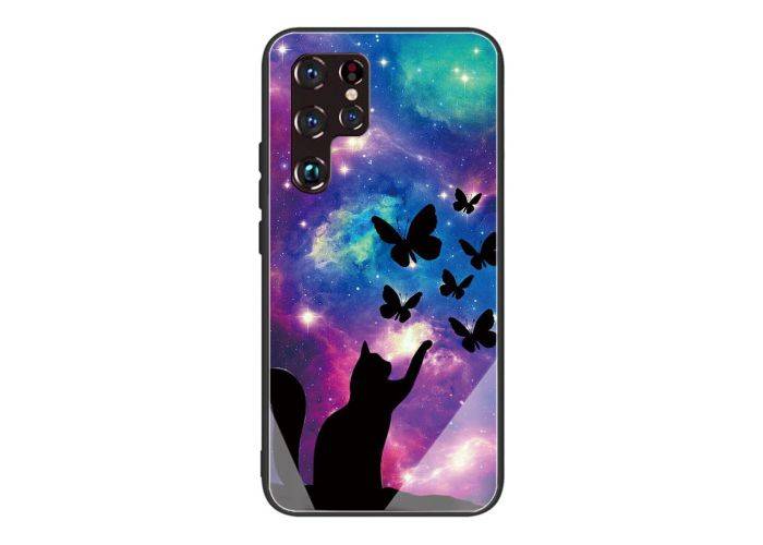 Samsung Galaxy S22 Ultra 5G - Hybrid cover m/bagside af hærdet glas - Kat & sommerfugl