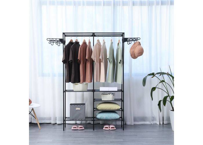 Super smart fritstående garderobeskab med flere hylder og 2 bøjlestænger, samt udvendige bøjler der kan placeres efter ønske. Masser af plads til opbevaring af tøj, sko og kasser. Pratisk og smart løsning til værelser, badeværelse, garderobe, entre og mange andre steder. Garderobestativet er fremstillet i en let stålkonstruktion der er holdbart og let at flytte rundt med.