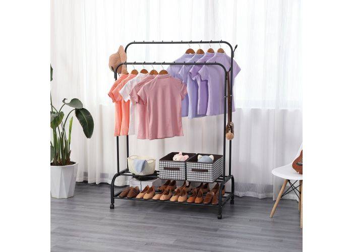 Super smart tøjstativ i metal og med hjul så du nemt kan flytte det ved f.eks. rengøring. Der er masser af til at hænge tøj, samt er der 2 hylder som kan bruges til f.eks. sko, kasser eller andet. Kan med fordel bruges i både hjemmet eller arbejdspladsen
