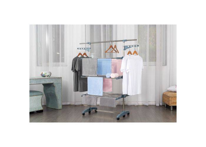 Dette tørrestativ er fuldt sammenklappeligt, modsat de fleste andre modeller hvor kun hylderne kan slås sammen, så kan denne foldes helt sammen så den kun fylder 14 cm i bredden. Denne nyeste udgave er i ekstra god kvalitet og i rustfrit stål og ABS materialer, og et virkeligt godt pladsbesparende tørre og tøjstativ.