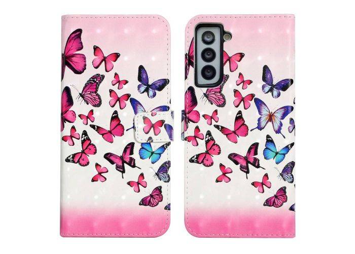 Samsung Galaxy S21 FE 5G - Premium cover / pung - Printet design - Pink/blå sommerfugl