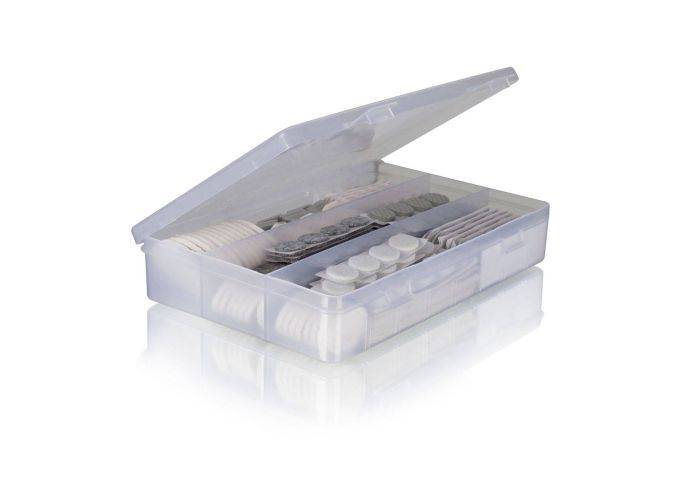 Rigtig godt sæt med hele 122 stk. filt med selvklæb i 6 forskellige størrelser og i hvid og grå farve og det hele kommer i en praktisk opbevaringskasse