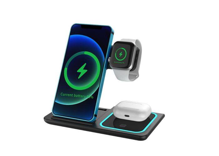 Højkvalittes Trådløs oplader i flot 3-i-1 design som tillader du kan oplade din smartphone, Apple Watch og AirPods på samme tid. Slip for besværet med at tilslutte kabler til alle dine enheder og placer dem blot på din nye flotte Trådløse oplader og du får nemt opladning. Den understøtter desuden HURTIG opladning som kan sørge for meget hurtigere opladning end vanlige modeller. Du kan også bruge denne oplader som holder til at se film/serier, det kan være smart til f.eks køkkenet eller kontoret.