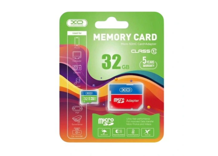 Få pålidelig og kompakt lagerplads med dette XO 32 GB microSDHC hukommelseskort. Kortet leveres med en praktisk SD-adapter, hvilket betyder, at du kan bruge det både i enheder med microSD-slot og i enheder med almindeligt SD-kortslot – f.eks. kameraer, bærbare computere og kortlæsere.